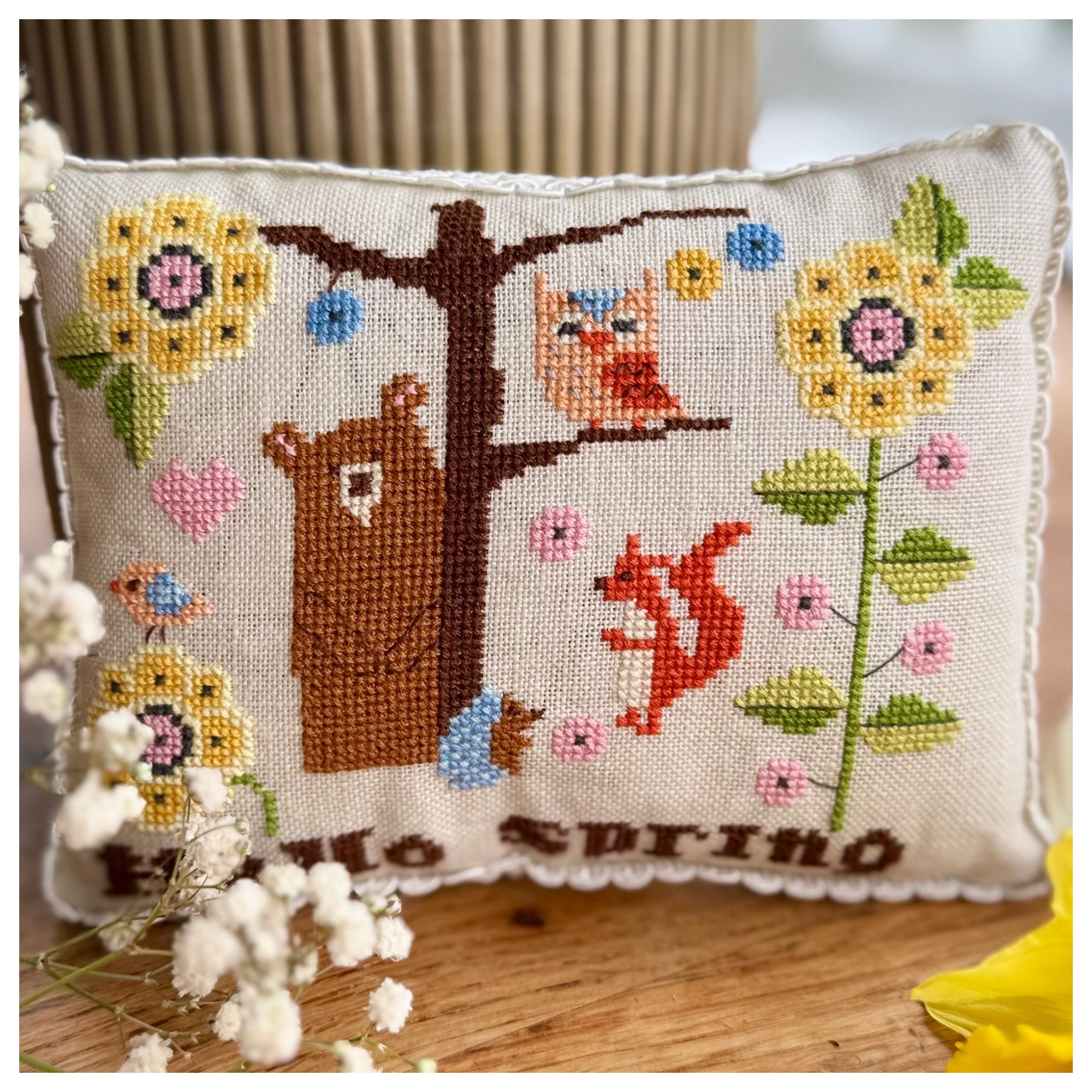 Cross-stitch patterns, kits & painted decorations with a cozy, handmade touch.